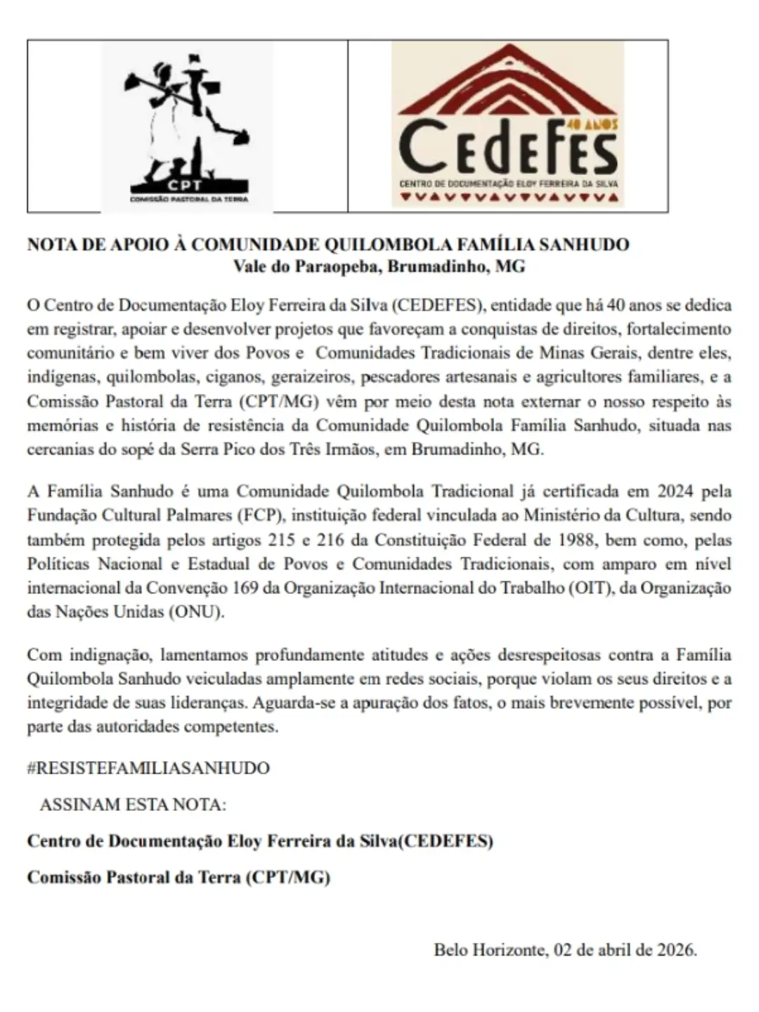 O CENTRO DE DOCUMENTAÇÃO ELOY FERREIRA DA SILVA (CEDEFES), entidade que há 40 anos se dedica em registrar, apoiar e desenvolver projetos que favoreçam a conquistas de direitos, fortalecimento comunitário e bem viver dos Povos e Comunidades Tradicionais de Minas Gerais, dentre eles, indígenas, quilombolas, ciganos, geraizeiros, pescadores artesanais e agricultores familiares, e a Comissão Pastoral da Terra (CPT/MG) vêm por meio desta nota externar o nosso respeito às memórias e história de resistência da Comunidade Quilombola Família Sanhudo, situada nas cercanias do sopé da Serra Pico dos Três Irmãos, em Brumadinho, MG.